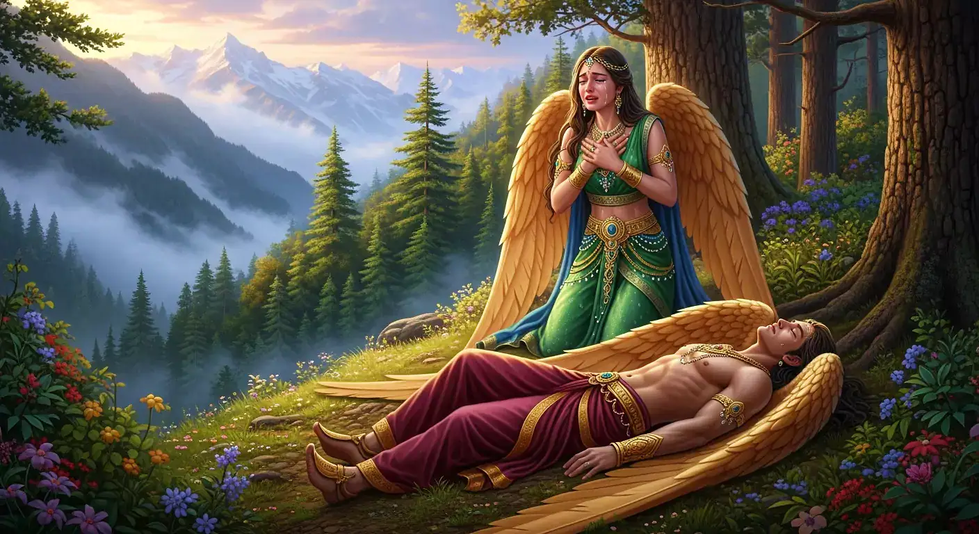 Picking up a piece of bamboo, the male fairy began to play upon it and sang with a honeyed voice; his mate waved her soft hands, danced nearby, and sang along. The king caught the sound, and treading softly so that his steps might not be heard, he approached and stood watching the fairies from a hiding-place. He immediately fell in love with the female fairy. “I will slay the husband,” thought he, “and live here with the wife.” Then he shot the fairy Canda. Lamenting in his pain, Canda uttered four stanzas: