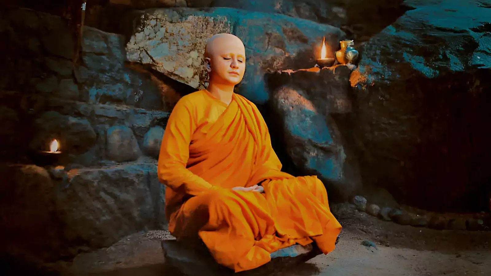 Inside her room, Sumedhā cut off her soft, rich, black hair with a sword. With the door closed, she started meditating and reached the first meditative absorption.