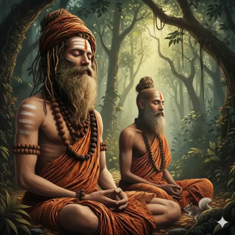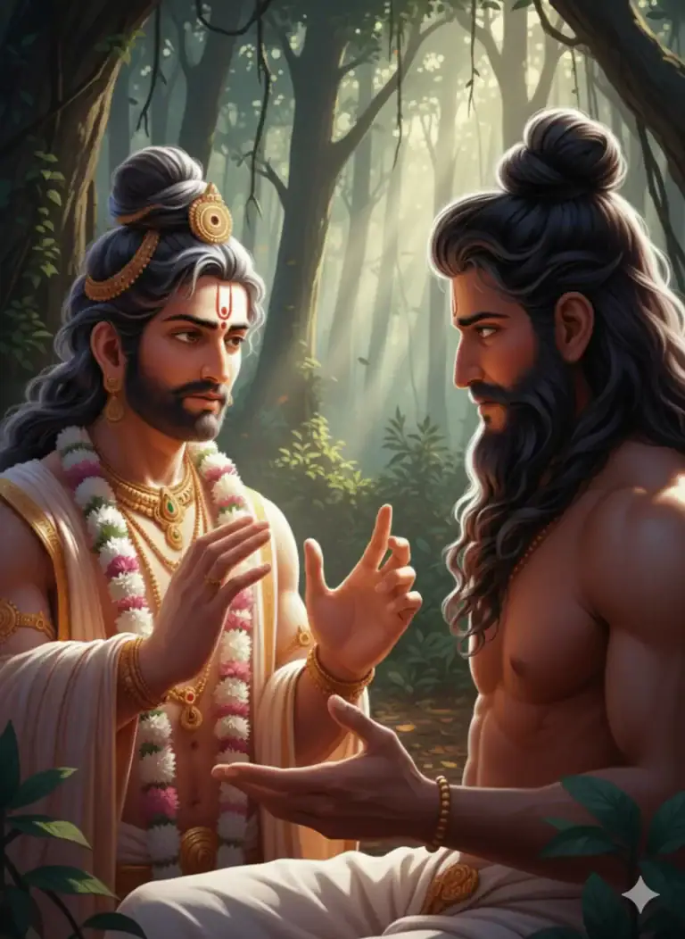 The prince took him to the ascetic, who, upon seeing them, asked, “With what purpose are you two descendants of a common ancestor walking here?” He then explained their relationship. The man-eater believed him and said, “Dear friend, you go home. As for me, I am born with two natures in one form. I have no wish to be a king. I’ll become an ascetic.”
