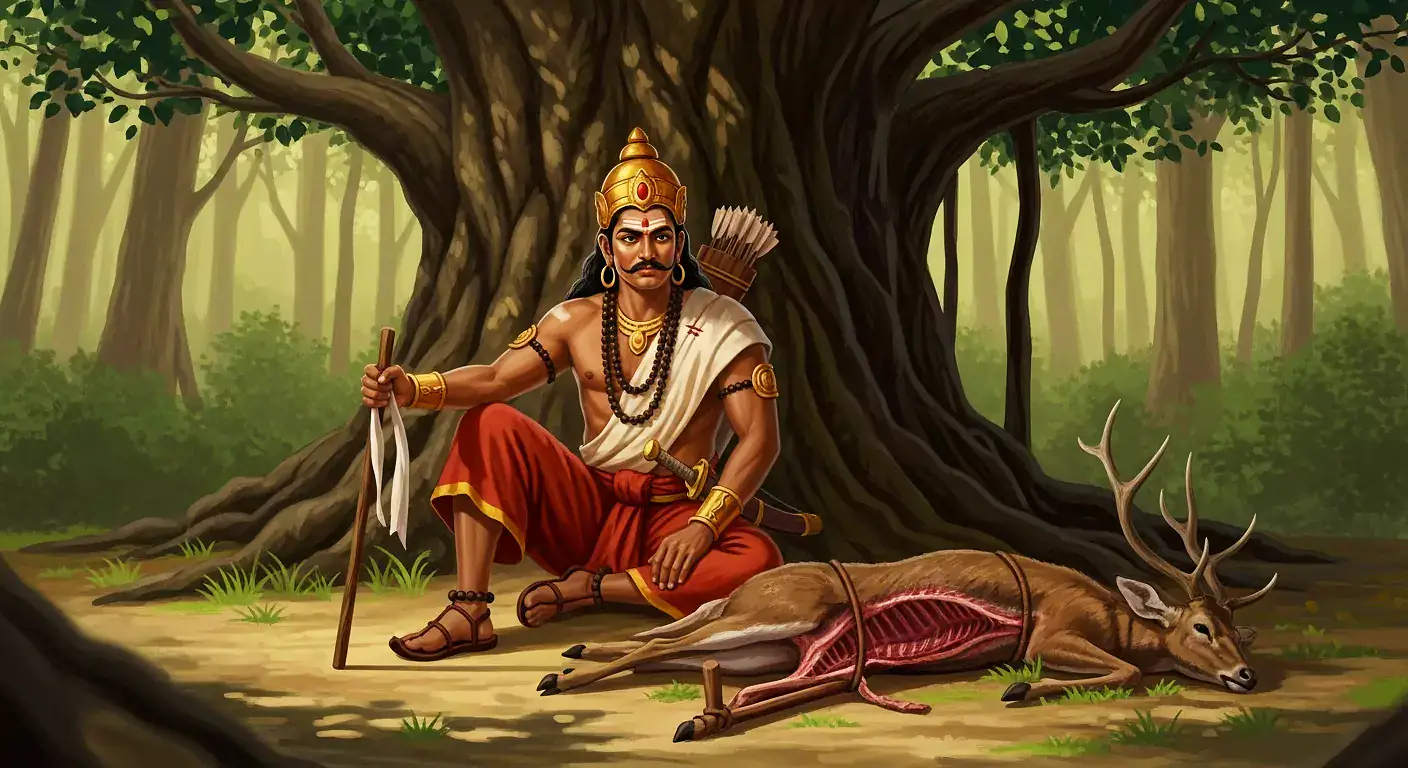 On the seventh day, King Jayaddisa proclaimed a hunt and set out from the city. Just as he was starting, a brahmin named Nanda, who supported his parents, came into the king’s presence, presenting four stanzas, each worth a hundred pieces of money. The king stopped to listen and assigned him a dwelling-place. Then, going to the hunt, he said, “The man on whose side the deer escapes shall pay the brahmin for his verses.”