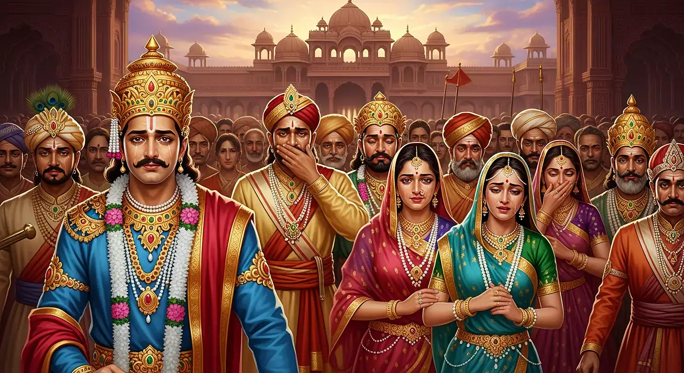 Then his parents, sister, wife, and the courtiers went forth from the city with him. The prince inquired of his father as to the way and, after making careful arrangements and admonishing the others, he ascended the road toward the abode of the ogre, as fearless as a maned lion. His mother, seeing him depart, could not restrain herself and fell fainting to the earth. His father, stretching out his arms, wept aloud.