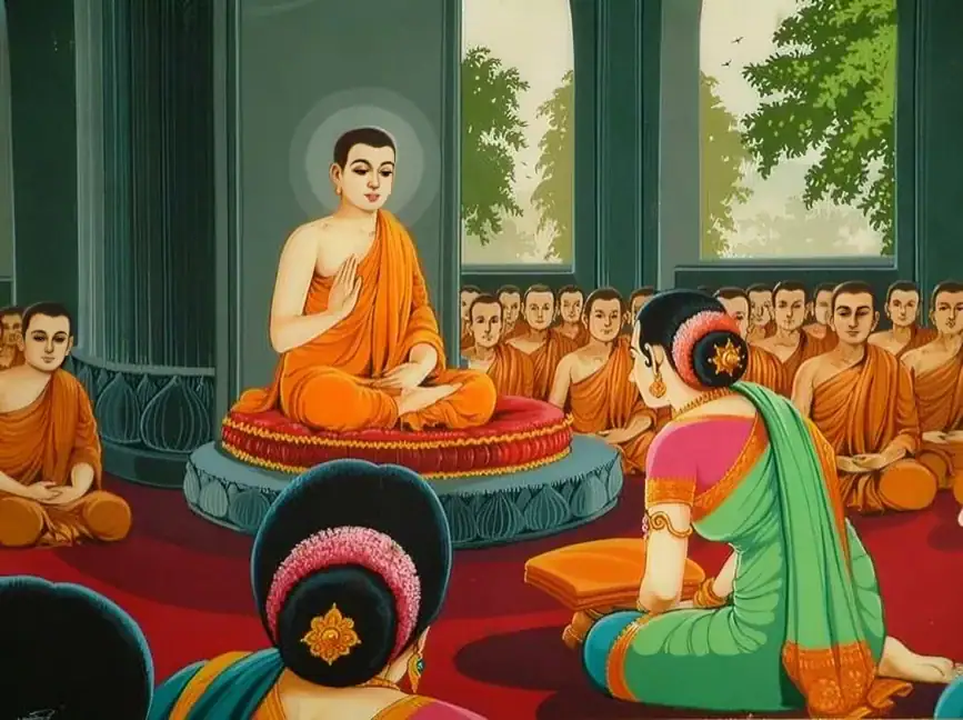 On one occasion, the Venerable Soṇa Kutikaṇṇa, on his return from the Buddha’s monastery, was requested by his mother to preach the Buddha’s words for her benefit. In compliance, he delivered a discourse in the ‘Community hall for Dhamma Lectures’ at the Town Square. As he was starting his discourse from the raised platform, with his mother as the chief listener, Kātiyāni the householder, in the company of her friend Kāḷī, arrived and was reverentially listening to the discourse among the audience.
