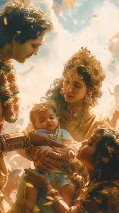 හැඳි පිරිසිදු කසීසළු ඇති, පැළඳි කුණ්ඩලාභරණ ඇති, ගල්වන ලද අගිල් සඳුන් සුවඳ ඇති, සඳ-හිරු කුමරුවෝ ඒකරාජ නම් රජුගේ යාගයට ගෙනයනු ලබන්නෝ ය…….