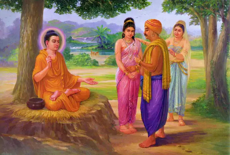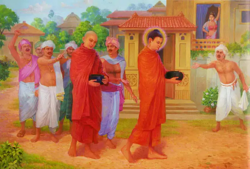 Brahmin Magandhi returned early after spending almost all night outside the village in offering lights, according to their custom. On His way to the village to receive food in the morning, the Buddha noticed Magandhi coming from the opposite direction at a distance. He grasped the opportunity of making His presence known to the old Brahmin. On seeing Him, Magandhi thought to himself: