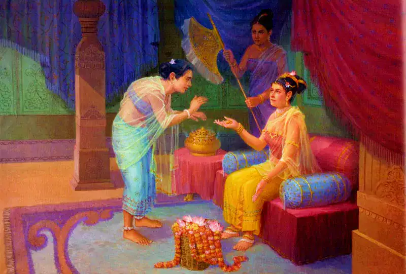 “Why dear Uttarā, you have such a big basket of flowers today, unlike the previous days! Did the King increase my allowance for flowers?”