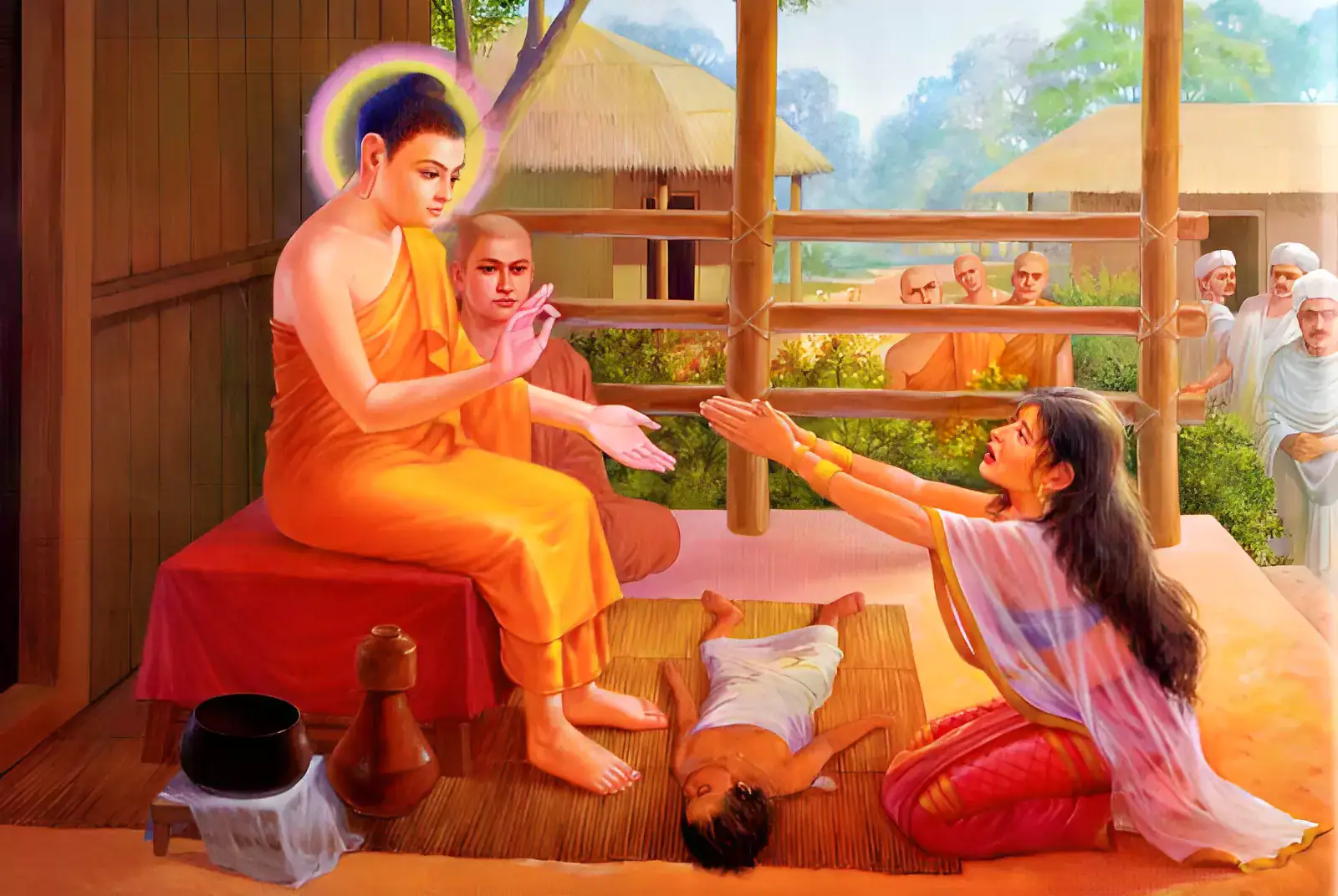 She immediately followed his advice and hurried to Jetavana, Anāthapiṇḍika’s monastery, where the Buddha was staying. Arriving in renewed hope, with the child’s corpse in her arms, she ran up to the Buddha and said to him,