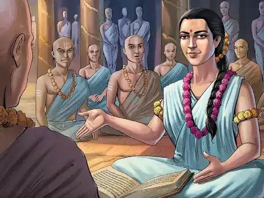 In time, she became learned in various doctrines which were acquired at various places and was also unequalled in expounding doctrines. She would go from place to place to find her match in the exposition of doctrines. As a mark of open challenge, she would set up a heap of sand at the entrance to the town or village she visited, on the top of which she would plant a twig of Eugenia. She would tell the children nearby to let everybody know that anyone, who could outwit her in the exposition of doctrines, might signal his or her challenge by destroying the Eugenia twig. If after seven days there appeared no challenger, she would pluck up the Eugenia twig in triumph and go on to another place.