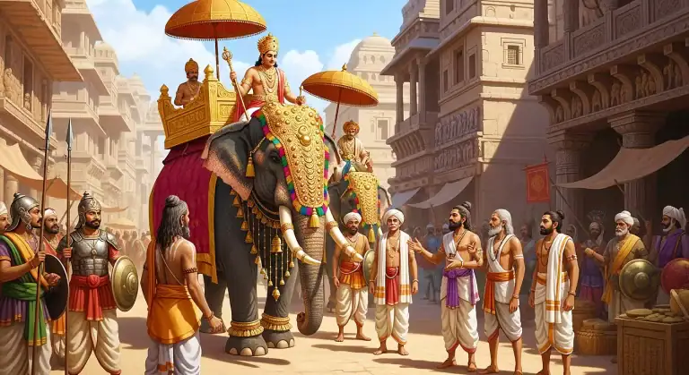 “O king, there is no need for battle. The Kuru king is fond of giving; he delights in giving. If asked, he would even cut off his head in all its magnificence, or pluck out his gracious eyes, or surrender his very kingdom. There will be no need to plead for the elephant—he will give it without fail.”