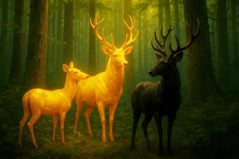 Once upon a time, in the city of Rājagaha in the kingdom of Magadha, there ruled a certain king of Magadha. In his days the Bodhisatta was reborn as a stag. Growing up, he dwelt in the forest as the leader of a herd of a thousand deer. He had two young ones named Luckie and Blackie. When he grew old, he entrusted his charge to his two sons, placing five hundred deer under the care of each. Thus, the two young stags became leaders of the herd.