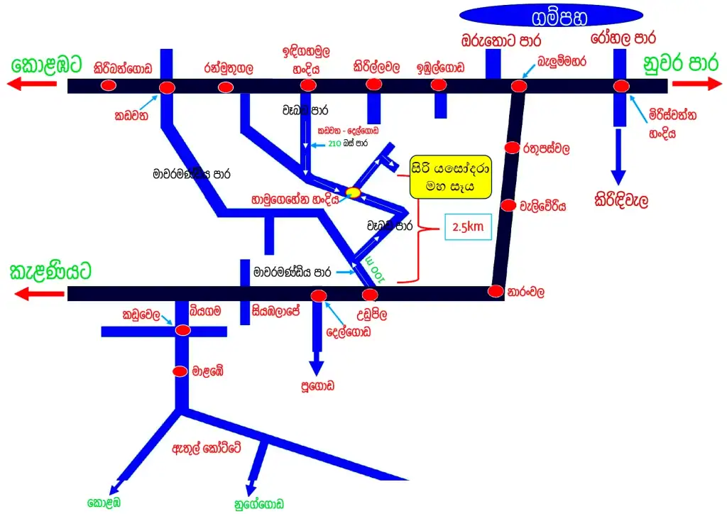 Highway එකෙන් කඩවතට එන්න. (කොළඹ-නුවර පාරේ) එතැනින් නුවර පැත්තට පැමිණ ඉඳිගහමුල හංදියෙන් දකූණට (වෑබඩ පාරට) හැරෙන්න. එතැනින් වෑබඩ පාර දිගේ හාමුගේහේන හංදියට (4km ක් පමණ) එන්න. එතැනින් වමට හැරී එන්න.