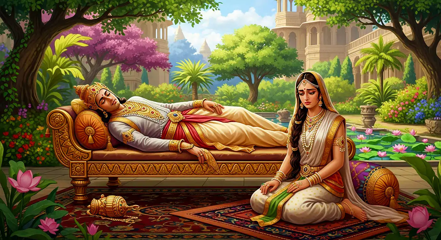 Then it was that Sudassana’s queen, Subhadda, marked how, after coming down from the Palace of Truth, her lord was lying upon his right side on the couch prepared for him in the palm-grove, which was all of gold and jewels—that couch from which he was not to rise again. And she said, “Eighty-four thousand cities, chief of which is the royal city of Kusavati, own your sovereignty, sire. Set your heart upon them.”
