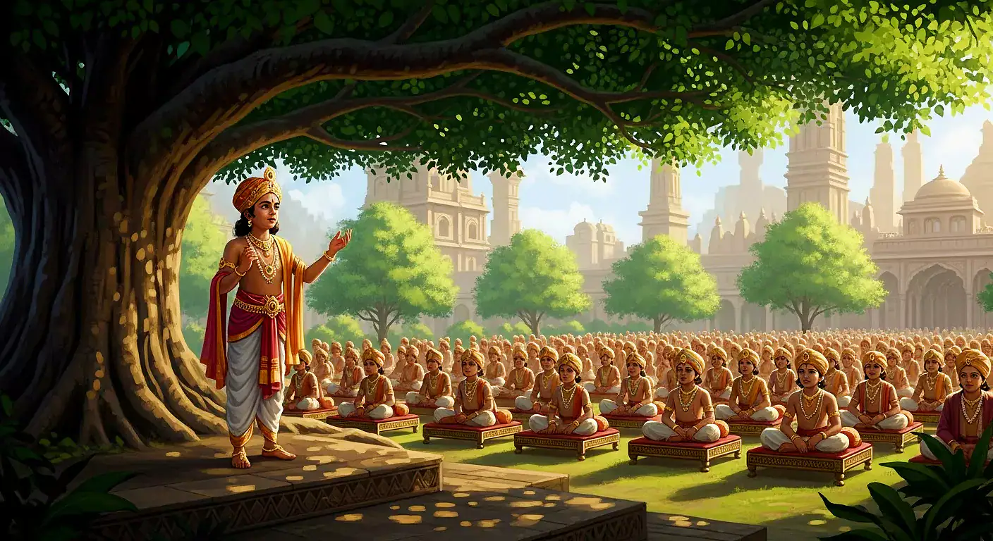 “Sire, you dwell amidst your courtiers in a great continent surrounded by the sea, with the ocean in place of an encircling wall: lord of the earth, with a mighty empire, victorious, sole emperor, your glory has become great. You have sixteen thousand women drest in jewels and ornaments, women of all nations, resplendent like maidens divine. Thus provided for every need, every desire fulfilled, you have lived long in happiness and bliss. Then by what reason or what cause do you sacrifice your precious life to protect the sage?”