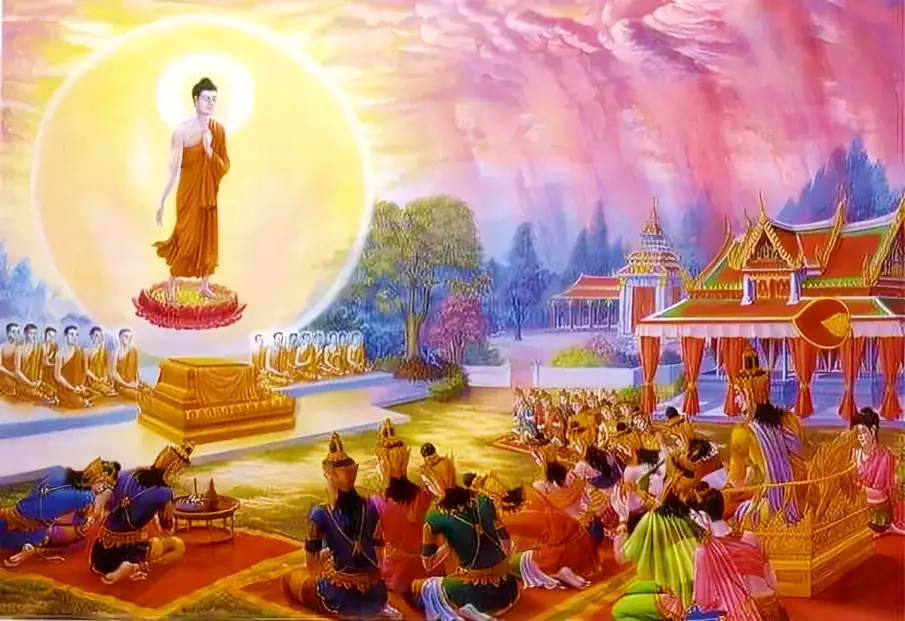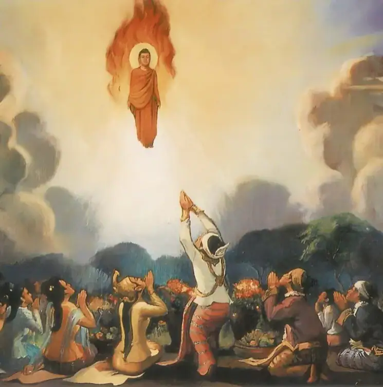 The Twin Miracle of fire-water, in pairs, springing from those parts or limbs of the body and producing alternately different patterns, was a matter for endless praise and admiration and it looked as if showers of particles from the soles of the Buddha were scattered on the heads of the Sakyan royalty——a strange and wonderful spectacle witnessed by devas, humans and Brahmās.