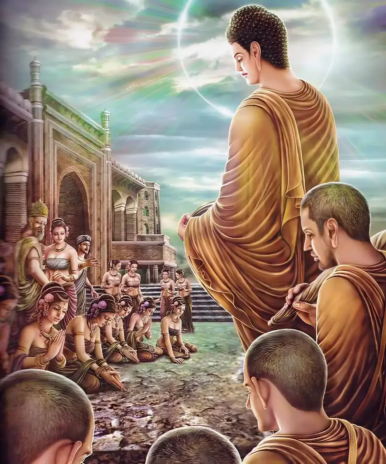 With this preface, he told the whole of royal family the glorious attributes of the Buddha. He did this with the object of sowing the seed of devoted faith in the hearts of His royal relatives even before they get the chance of seeing Him.