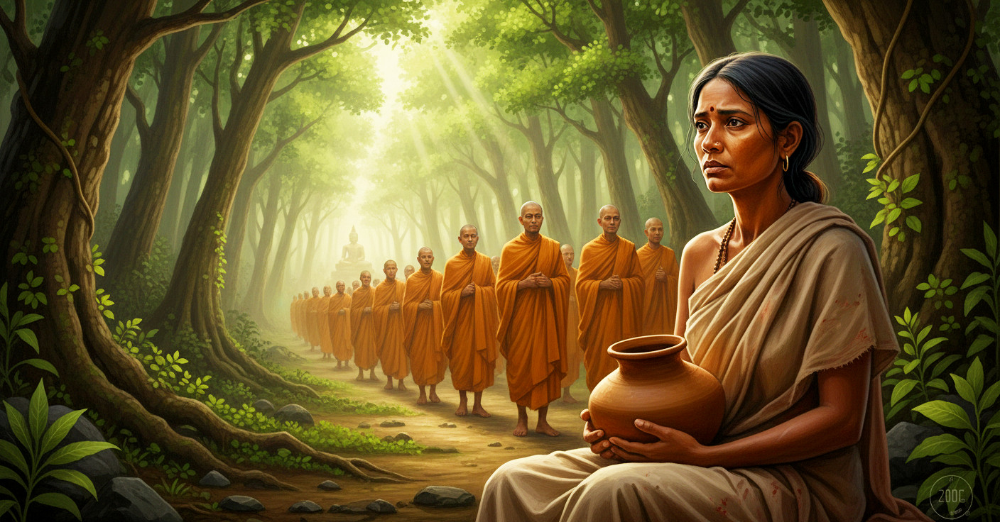 The chief of water carriers met the Pacceka Buddhas as they came out of the city at the city gate and putting down the water pot, she made obeisance. Then she asked the purpose of the revered ones in going into the city and coming out so soon from it. The Pacceka Buddhass told her that they were seeking assistance to have a small dwelling built for the rains-retreat period. And also on further inquiry, she learnt that the need was still unfulfilled. She asked them:
