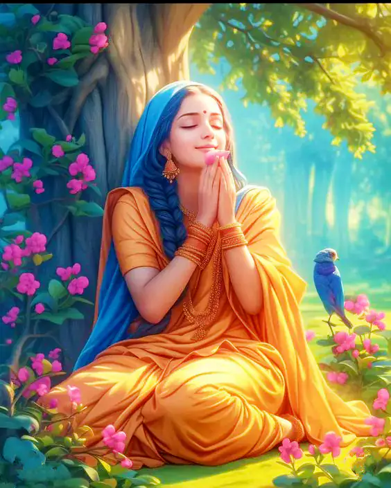 One day, when she had just turned sixteen, she went to the public flower gardens with her girlfriends, taking three portions of fermented rice along in her basket for her meal. When she was just leaving by the city gate, a group of ascetics came into town to obtain alms. Their leader stood out: one whose grandeur and sublime beauty impressed her so much that she impulsively offered him all the food in her basket.