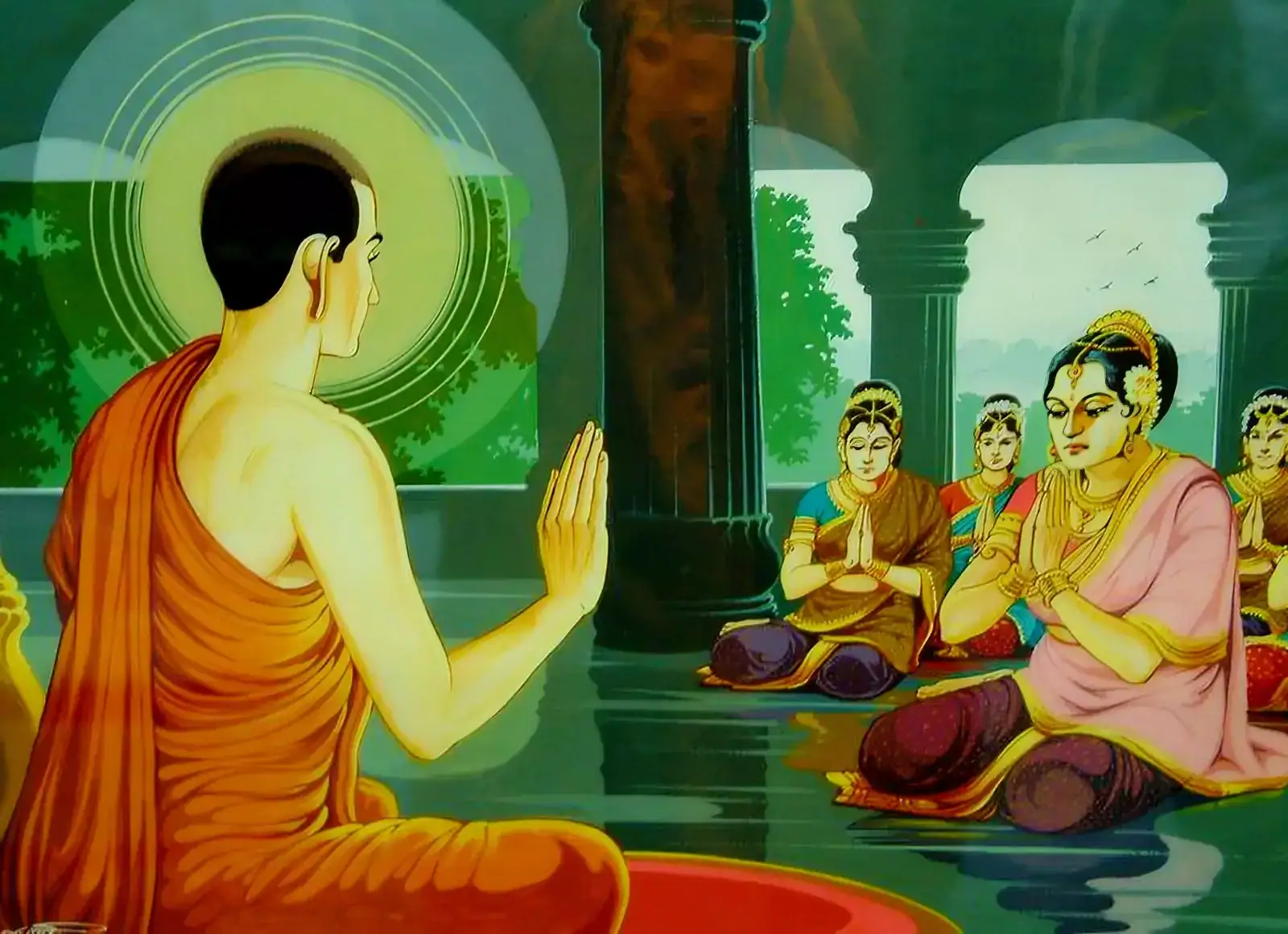 The king, who had become a devoted lay disciple of the Buddha, visited him one day again and met a wise and well-learned layman there. The king asked him whether he could give some daily Dhamma teaching to his two queens and the other ladies of the palace. The layman replied that the teaching came from the Enlightened One and only one of his ordained disciples could pass it on to the women. The king understood this and requested the Buddha to give permission to one of his monks to teach. The Buddha appointed the Venerable Ānanda for this task. Queen Mallikā learned easily in spite of her uneducated background, but Queen Vasabhakhattiyā, cousin of the Buddha and mother of the crown-prince, was unconcentrated and learned with difficulty (Vin IV 158).