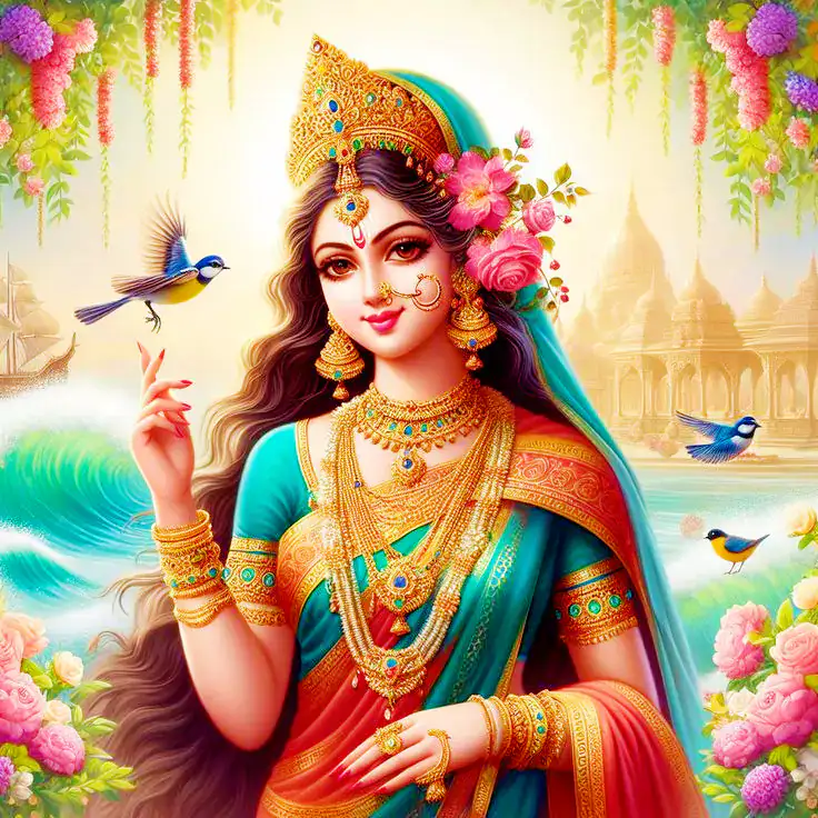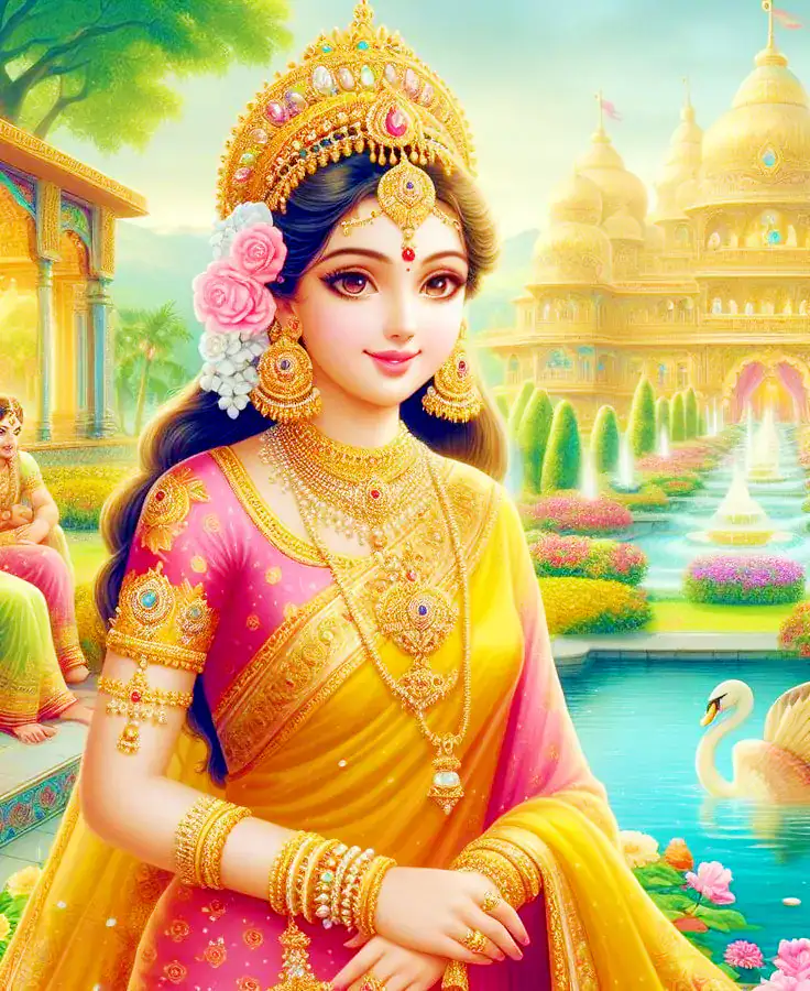 Devata, you are dressed in divine golden clothes and gold jewelry. Golden banners are waving in the sky. Even without this jewelry, your beauty shines brightly. You are wearing gold bangles, bracelets, and a necklace of gems. You wear a gold crown on your head and your body is covered with a golden net.