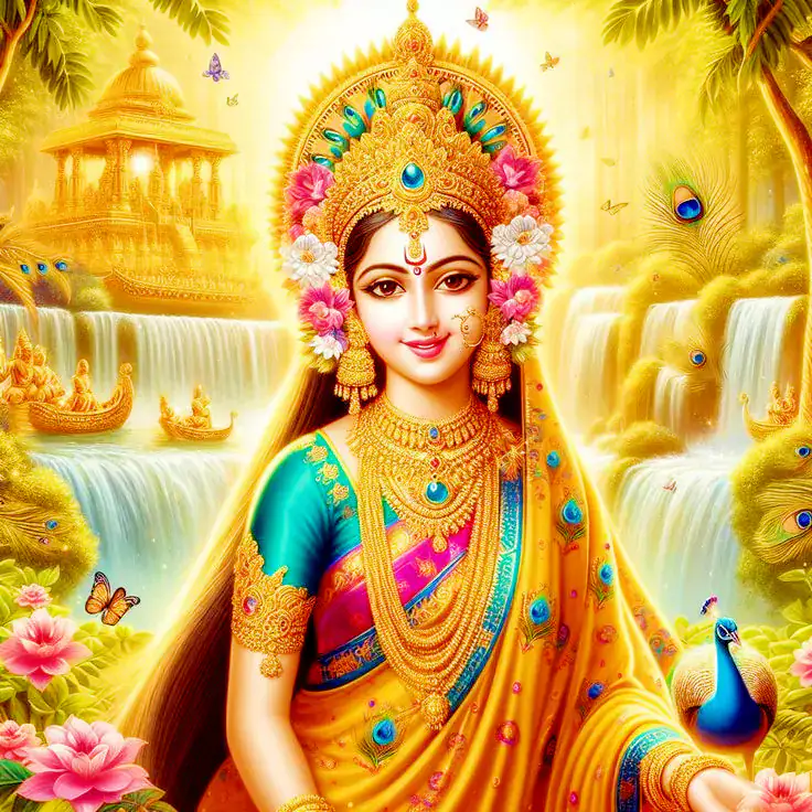 That is why I have received this delightful heavenly mango grove and large mansion. The sound of various musical instruments and the chatting of happy devatas can be heard around the mansion. There is a golden lamp that never goes out. There are trees with fruits made of divine cloth.