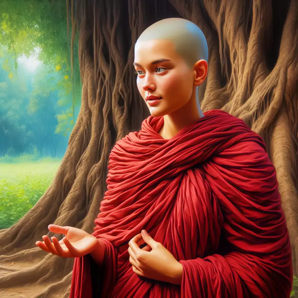 Instantly, she regained her mindfulness. A kindly man threw her his outer cloak. She put it on, and approaching the Enlightened One, she prostrated herself at his feet and told him her tragic story.