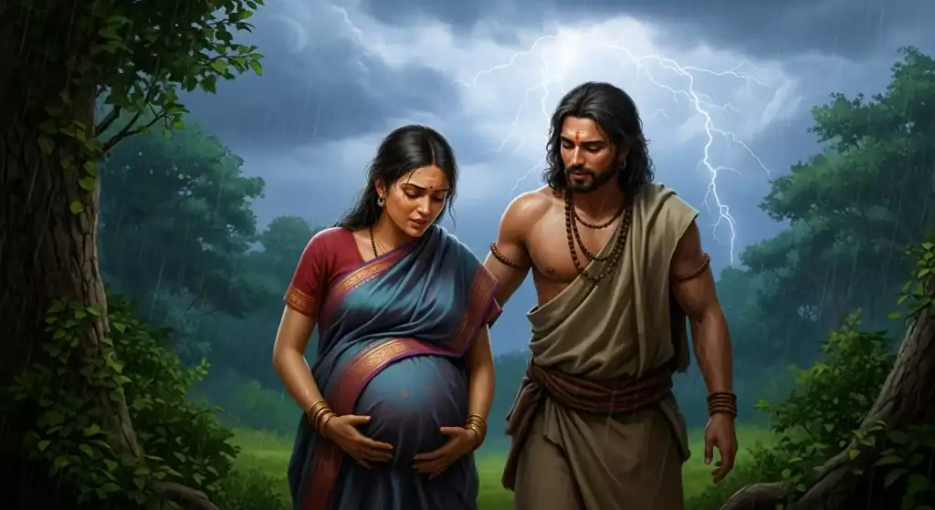 Sometime later Patācārā became pregnant a second time. Again she requested her husband to take her home to her parents, again he refused, and again she took matters into her own hands and started off, carrying her son. When her husband followed her and pleaded with her to return with him, she refused to listen. After they had travelled about halfway to Sāvatthī a fearful storm arose quite out of season, with thunder and lightning and incessant rain. Just then her birth-pains started.