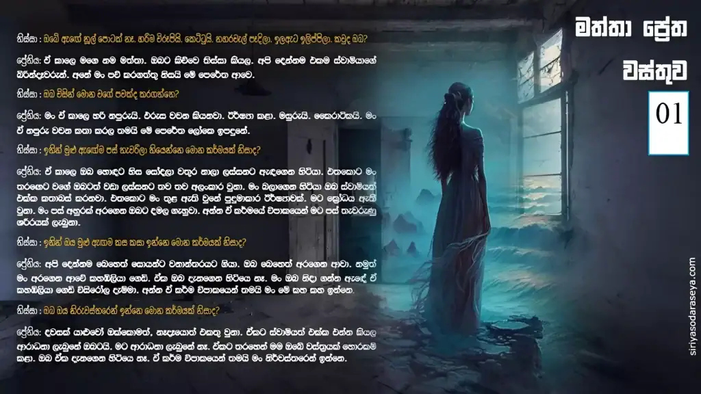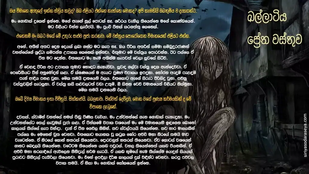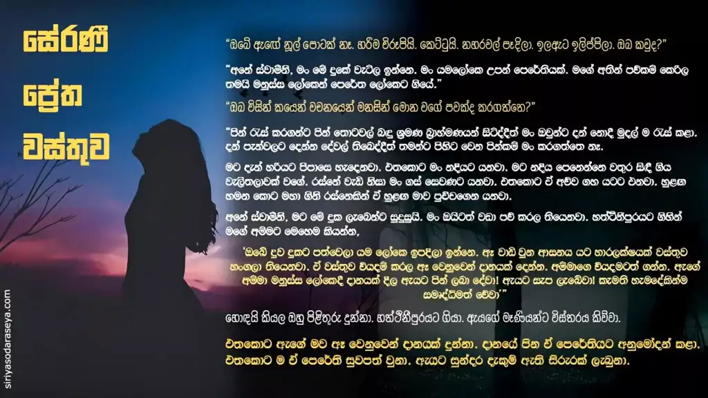 අනේ ස්වාමීනී, මං මේ දුකේ වැටිල ඉන්නෙ. මං යමලෝකෙ උපන් පෙරේතියක්. මගේ අතින් පව්කම් කෙරිල තමයි මනුස්ස ලෝකෙන් පෙරේත ලෝකෙට ගියේ.