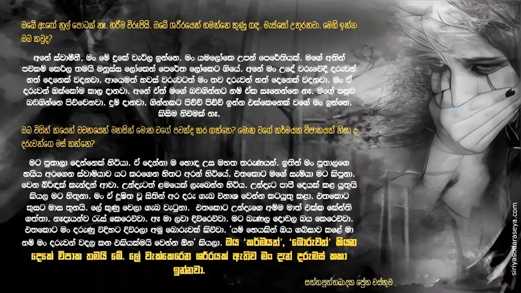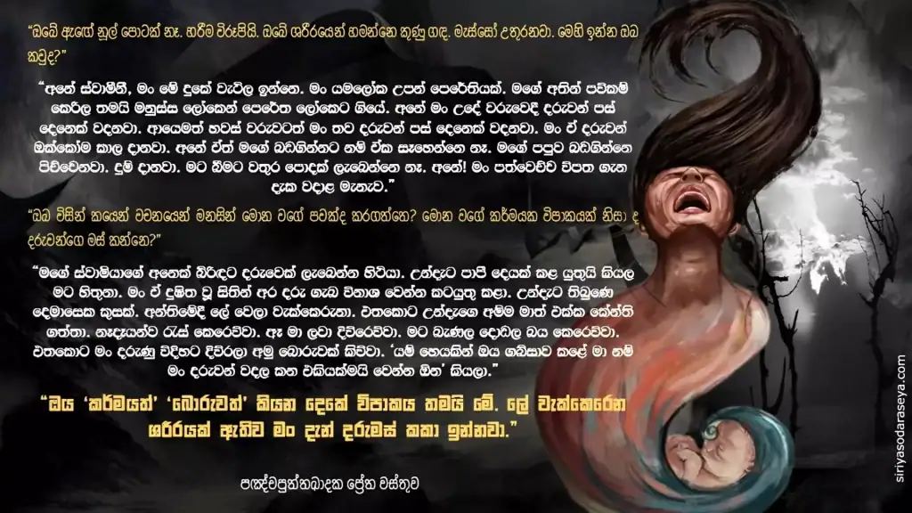ඔබ විසින් කයෙන් වචනයෙන් මනසින් මොන වගේ පවක්ද කර ගත්තෙ? මොන වගේ කර්මයක විපාකයක් නිසාද මිනිස් ලෝකෙන් පෙරේත ලෝකෙට ආවෙ?….