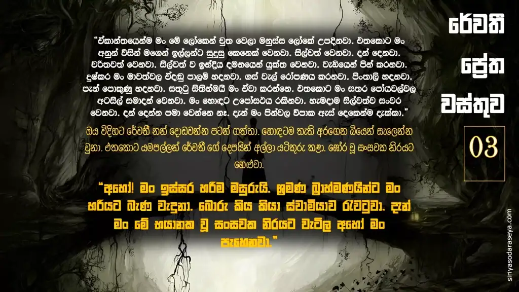 එම්බා රේවතී, නුඹ පාපී කෙනෙක්. දන් නොදෙන කෙනෙක්. තිට අපායෙහි දොර විවෘත වුනා. දැන් ඉතින් නැගිටපන්. දුගතියෙහි ඉපදුනාම නිරා දුකින් පෙළි පෙළී නිරි සතුන් තීව ඇදගෙන යන්නේ නම් තැනකටද එතැනට අපි තීව අරගෙන යනවා.