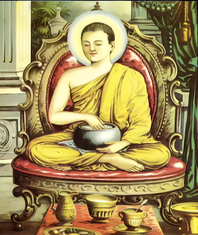 Out of compassion for the villager, the Buddha received the offering with the marble bowl given by the four Divine Kings and resolved that the food should proved inexhaustible even after distributing it to sixty-eight hundred thousand bhikkhus.
