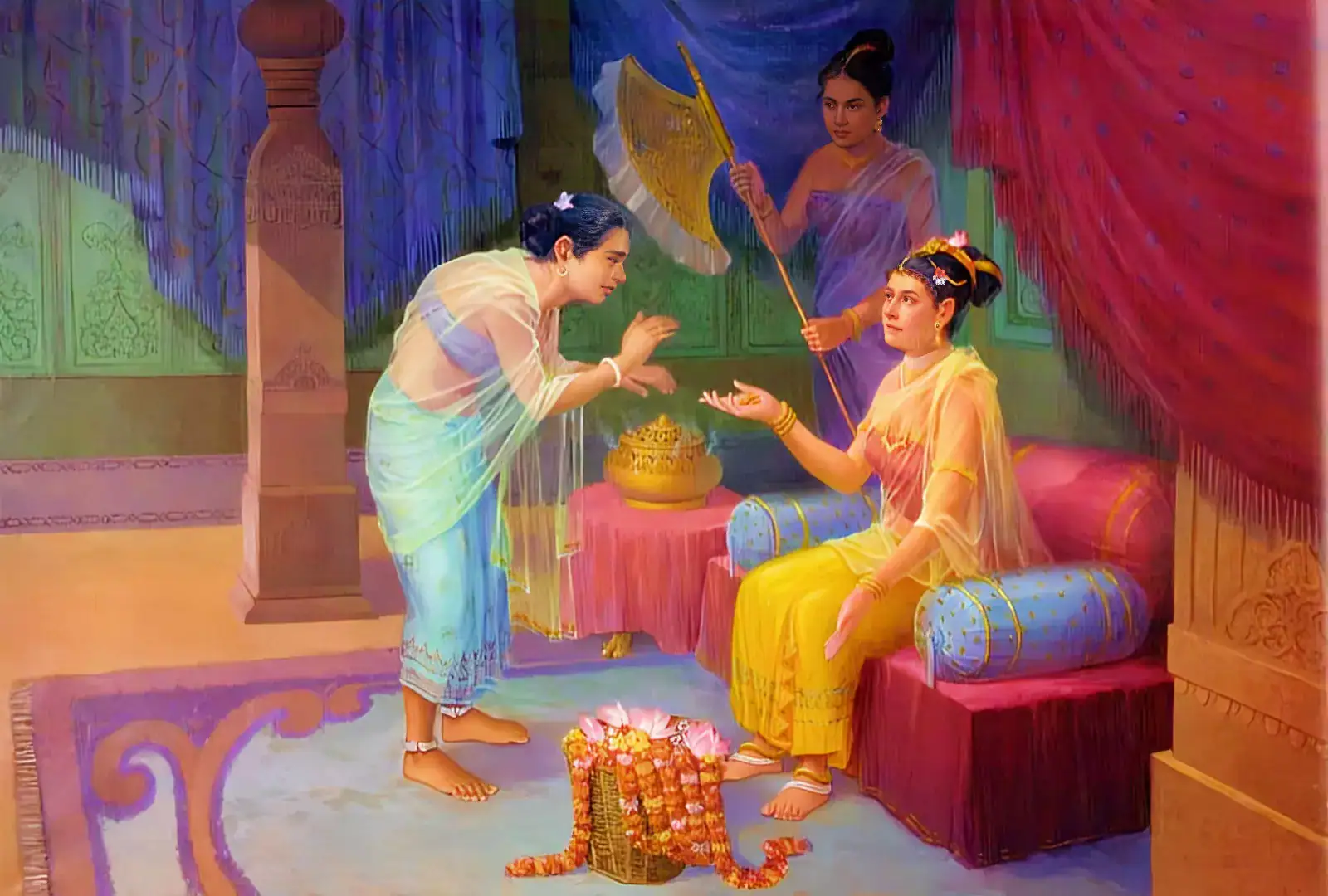 One day King Udena met the charming adopted daughter of his finance minister and fell in love with her at first sight. He felt magically attracted by her loving and generous nature. Sāmāvatī had exactly what was missing in both his other wives. King Udena sent a messenger to Ghosaka asking him to give Sāmāvatī to him in marriage. Ghosaka was thrown into an emotional upheaval. On the one hand, he loved Sāmāvatī above all else, and she had become indispensable to him. She was the delight of his life. On the other, he knew his king’s temperament and was afraid to deny him his request. But in the end his attachment to Sāmāvatī won and he thought: