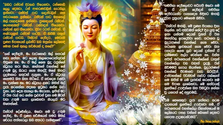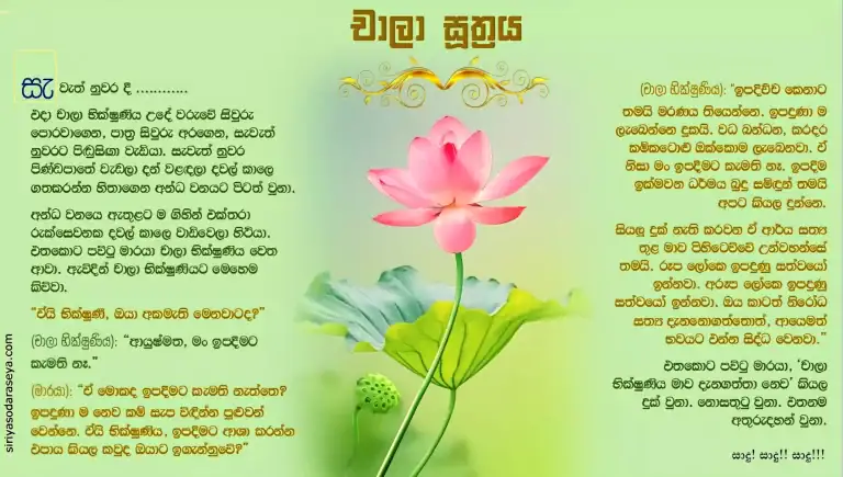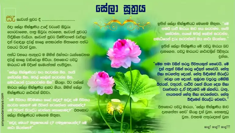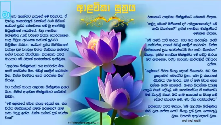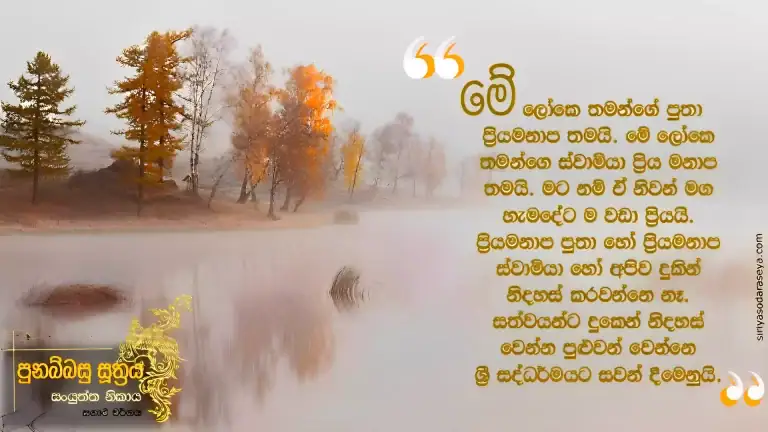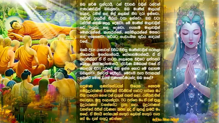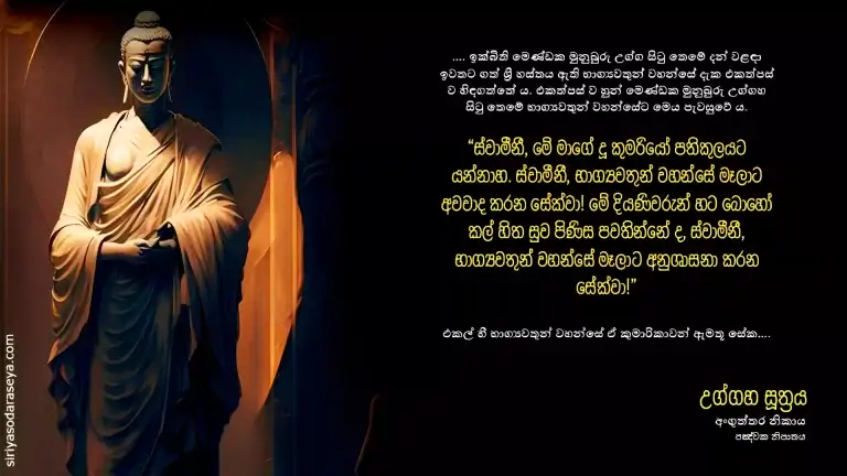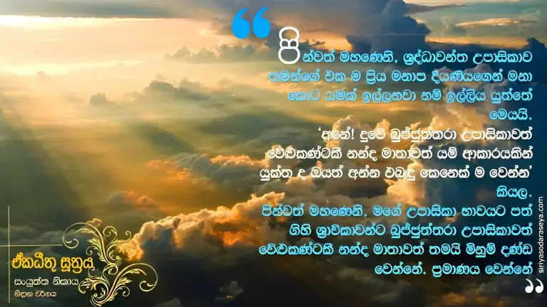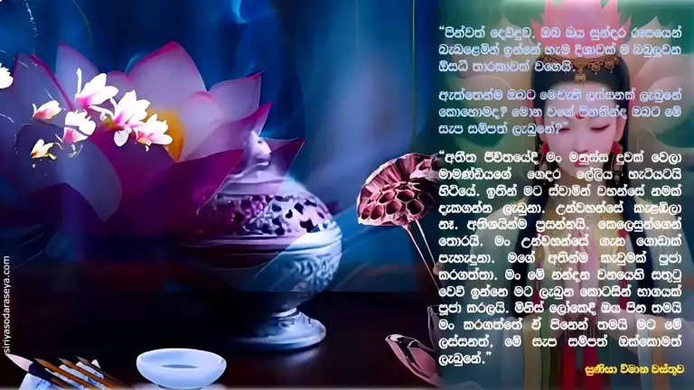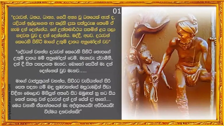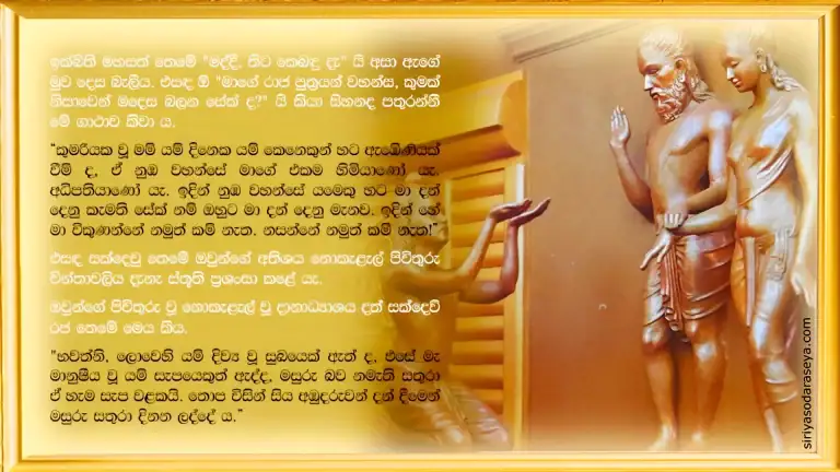 “අහෝ! ඒකාන්තයෙන් ම දුක් සයුරෙකි මේ ජීවිතය. ඒ භාග්යවතුන් වහන්සේ නම් සයුරින් එතෙරට වැඩියා. අමා සුව සලසා ගත්තා. ඒත්… අනේ! අපට කවදා නම් ලැබේද එබඳු සැනසිලි ජීවිතයක්. අනේ! ඒ උත්තමයෝ කොපමණ භාග්යවන්තයෝ ද?”