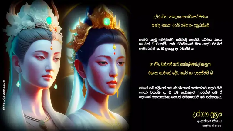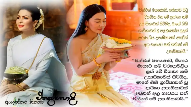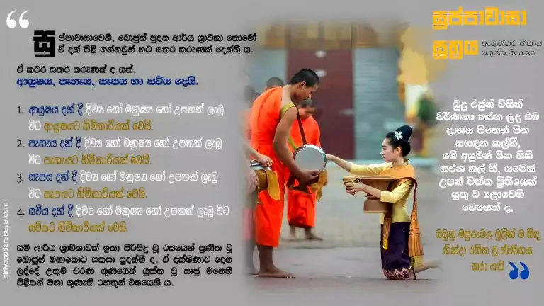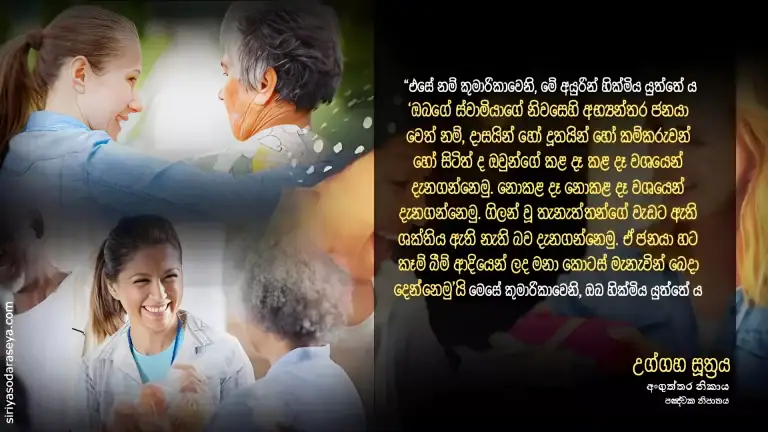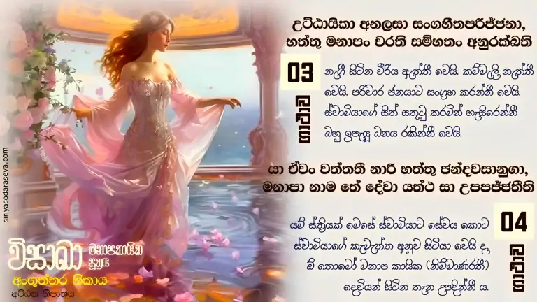 ශ්රද්ධාවෙනුත්, සීලයෙනුත්, ප්රඥාවෙනුත්, ත්යාගයෙනුත්, ශ්රැතයෙනුත් යම් ස්ත්රියක් මෙලොව දියුණු වෙනවා නම්, එබඳු සිල්වත් උපාසිකාව මේ ලෝකයේ දී තමාගෙන් ගතයුතු හරවත් දෑ ගන්නවා.