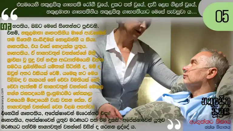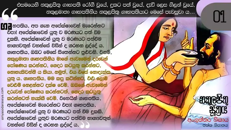 1. “ගෘහපතිය, අප ගැන අපේක්ෂාවෙන් මැරෙන්නට එපා! ගෘහපතිය, අපේක්ෂාවෙන් යුතුව මරණයට පත් වීම දුකකි. අපේක්ෂාවෙන් යුතුව මරණයට පත්වීම භාග්යවතුන් වහන්සේ විසින් ද ගරහන ලද්දේ ය. ගෘහපතිය, ඔබට මෙසේ සිතෙන්නට පුළුවනි. එනම්, නකුලමාතා ගෘහපතිනිය මාගේ ඇවෑමෙන් දරුවන් පෝෂණය කරන්නට, ගෙදර කටයුතු කරන්නට, නොහැකිවන්නී ය යනුවෙනි. ගෘහපතිය, එය එසේ නොදැක්ක යුතුය. ගෘහපතිය, මම කපු කටින්නට, එළු ලොම් වෙළුම් නෙළන්නට දක්ෂ වෙමි. ගෘහපතිය, ඔබගේ ඇවෑමෙන් දරුවන් පෝෂණය කරන්නට ත්, ගෙදර කටයුතු කරන්නට ත් හැක්කී වෙමි. එහෙයින් ගෘහපතිය, අපේක්ෂාවෙන් මැරෙන්නට එපා! ගෘහපතිය, අපේක්ෂාවෙන් යුතුව මරණයට පත් වීම දුකකි. අපේක්ෂාවෙන් යුතුව මරණයට පත්වීම භාග්යවතුන් වහන්සේ විසින් ද ගරහන ලද්දේ ය.