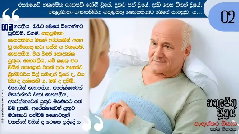 2. ගෘහපතිය, ඔබට මෙසේ සිතෙන්නට පුළුවනි. එනම්, නකුලමාතා ගෘහපතිනිය මාගේ ඇවෑමෙන් අන්ය වූ සැමියෙකු කරා යන්නී ය වශයෙනි. ගෘහපතිය, එය එසේ නොදැක්ක යුතුය. ගෘහපතිය, යම් කලක අප විසින් සොළොස් වසක් පුරා ගෘහස්ථ බ්රහ්මචරිය සිල් සමාදන් වූයේ ද, එය ඔබ ද දන්නෙහි ය. මම ද දනිමි. එහෙයින් ගෘහපතිය, අපේක්ෂාවෙන් මැරෙන්නට එපා! ගෘහපතිය, අපේක්ෂාවෙන් යුතුව මරණයට පත් වීම දුකකි. අපේක්ෂාවෙන් යුතුව මරණයට පත්වීම භාග්යවතුන් වහන්සේ විසින් ද ගරහන ලද්දේ ය.