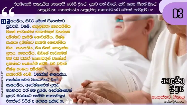 3. ගෘහපතිය, ඔබට මෙසේ සිතෙන්නට පුළුවනි. එනම්, නකුලමාතා ගෘහපතිනිය මාගේ ඇවෑමෙන් භාග්යවතුන් වහන්සේ දකින්නට කැමති නොවන්නී ය. භික්ෂු සංඝයා දකින්නට කැමති නොවන්නීය වශයෙනි. ගෘහපතිය, එය එසේ නොදැක්ක යුතුය. ගෘහපතිය, ඔබගේ ඇවෑමෙන් මම වඩ වඩා ත් භාග්යවතුන් වහන්සේ දකින්නට කැමැත්තී වෙමි. වඩ වඩා ත් භික්ෂු සංඝයා දකින්නට කැමැත්තී වෙමි. එහෙයින් ගෘහපතිය, අපේක්ෂාවෙන් මැරෙන්නට එපා! ගෘහපතිය, අපේක්ෂාවෙන් යුතුව මරණයට පත් වීම දුකකි. අපේක්ෂාවෙන් යුතුව මරණයට පත්වීම භාග්යවතුන් වහන්සේ විසින් ද ගරහන ලද්දේ ය.