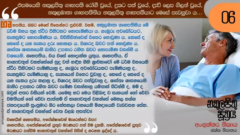 6. ගෘහපතිය, ඔබට මෙසේ සිතෙන්නට පුළුවනි. එනම්, නකුලමාතා ගෘහපතිනිය මේ ධර්ම විනය තුළ ස්ථිර පිහිටකට නොපැමිණියා ය. ගැඹුරු අවබෝධයට නොපැමිණියා ය. සැනසුමට නොපැමිණියා ය. විචිකිච්ඡාවෙන් එතෙර නොවුණා ය. කෙසේ ද කෙසේ ද යන සැකය දුරු නොකළා ය. විශාරද බවට පත් නොවුණා ය. ශාස්තෘ ශාසනයෙහි බාහිර උපකාර රහිත බවට නොපැමිණ වසන්නී ය වශයෙනි. ගෘහපතිය, එය එසේ නොදැක්ක යුතුය. ගෘහපතිය, ඒ භාග්යවතුන් වහන්සේගේ සුදු වත් හඳින ගිහි ශ්රාවිකාවෝ මේ ධර්ම විනයෙහි ස්ථිර පිහිටකට පැමිණියාහු ද, ගැඹුරු අවබෝධයකට පැමිණියාහු ද, සැනසුමට පැමිණියාහු ද, සැකයෙන් එතෙර වූවාහු ද, කෙසේ ද කෙසේ ද යන සැකය දුරු කළාහු ද, විශාරද බවට පත්වූවාහු ද, ශාස්තෘ ශාසනයෙහි බාහිර උපකාර රහිත බවට පැමිණ වසන්නාහු යම්තාක් සිටින්නී ද, මම් ද ඔවුන් අතර එකියක් වෙමි. යමෙකු හට මෙය පිළිබඳ ව සැකයක් හෝ වේවා විමතියක් හෝ වේවා ඇත්නම් ඒ භාග්යවතුන් වහන්සේ මෙකල භග්ග ජනපදයෙහි සුංසුමාර ගිර භේසකලා වනයෙහි මිගදායෙහි වැඩවසන සේක. ඒ භාග්යවතුන් වහන්සේ වෙත එළඹ අසත්වා! එහෙයින් ගෘහපතිය, අපේක්ෂාවෙන් මැරෙන්නට එපා! ගෘහපතිය, අපේක්ෂාවෙන් යුතුව මරණයට පත් වීම දුකකි. අපේක්ෂාවෙන් යුතුව මරණයට පත්වීම භාග්යවතුන් වහන්සේ විසින් ද ගරහන ලද්දේ ය.”