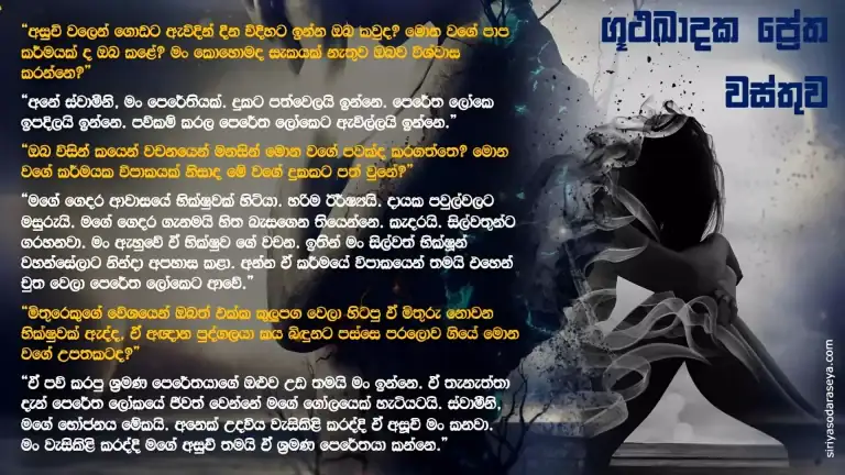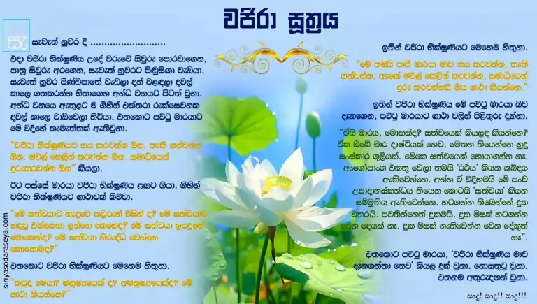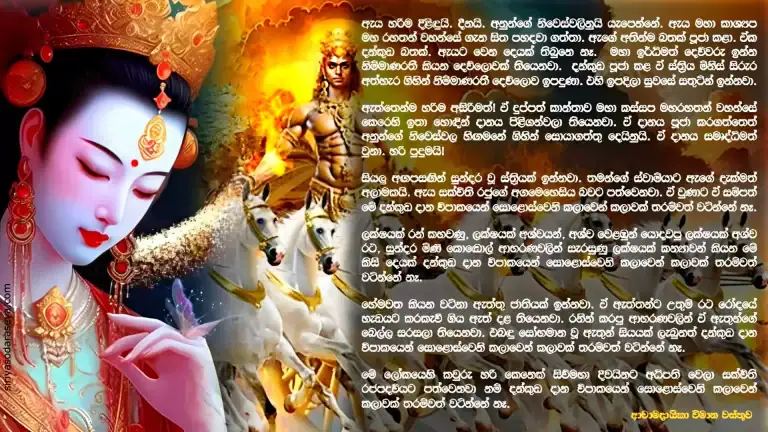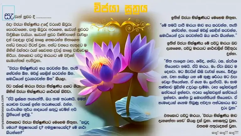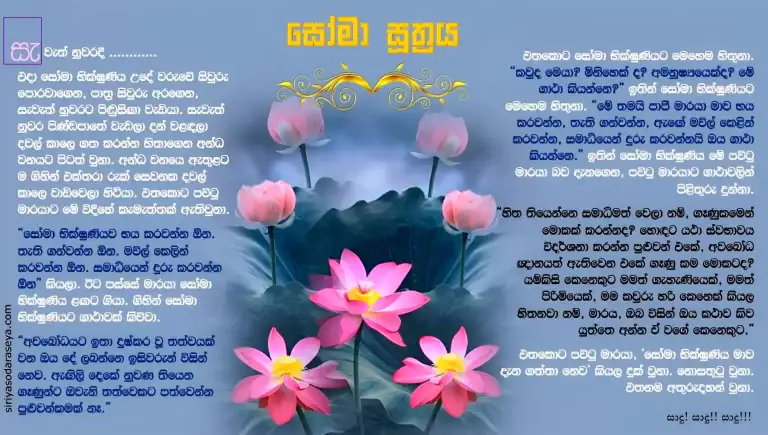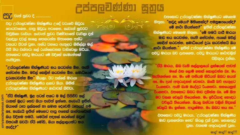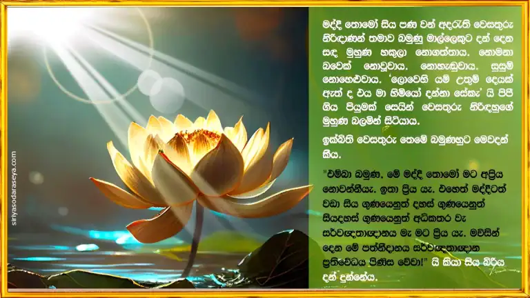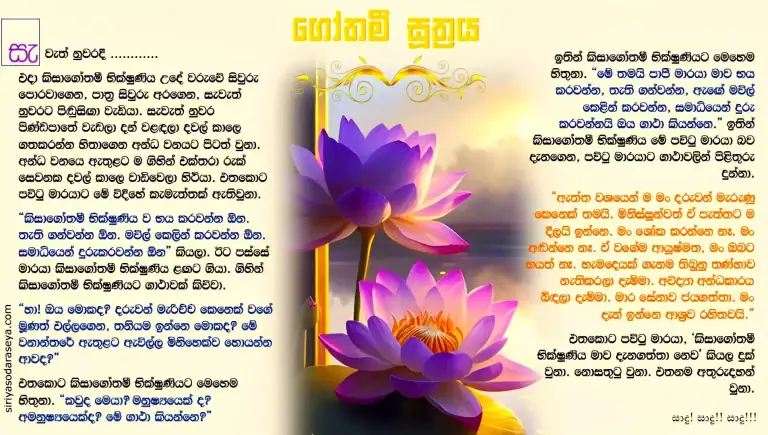 “ස්වාමීනී, එය එසේම ය. එහෙත් නිමේෂයක් සිතා බලනු මැනවි. ස්ත්රීන්ට ද ඇත්තේ සිතකි කයකි. ඈද ඇස කන ආදී ද්වාරයන්ගෙන්ම අරමුණු ගනිමින් මේ මායා ලෝකයේ අතරමංව සිතට වසඟව දුක් දොම්නස් ම වැළැඳගෙන සිටියි. ඉතින් ස්ත්රියක් වූ පමණෙකින් ඈ සදහට ම සසරේ දුක් විඳිය යුතුද? රාගයත් ද්වේෂයත් අතර වූ රියසකට සැමදා යට වී සිටිය යුතු ද? සියළු බන්ධනයන්ගෙන් මිදී දුකින් නිදහස් ව විමුක්තිය සාක්ෂාත් නො කළ යුතු ද? නැත ස්වාමීනී. ස්ත්රිය ද සොයා යා යුතු ම ය ඒ අමා!”
