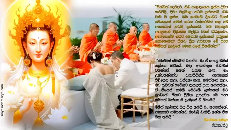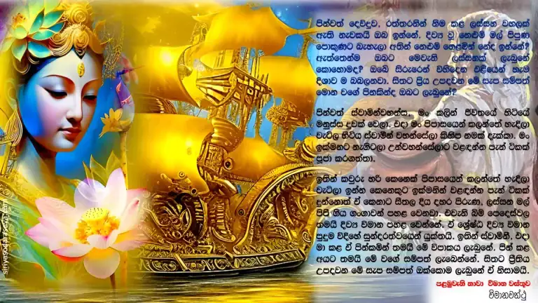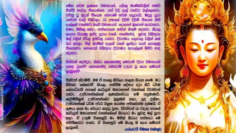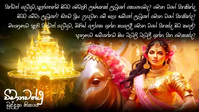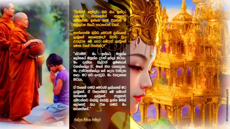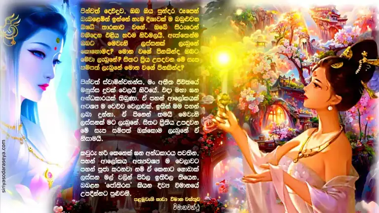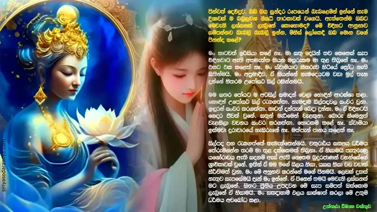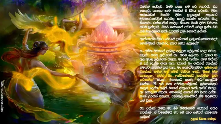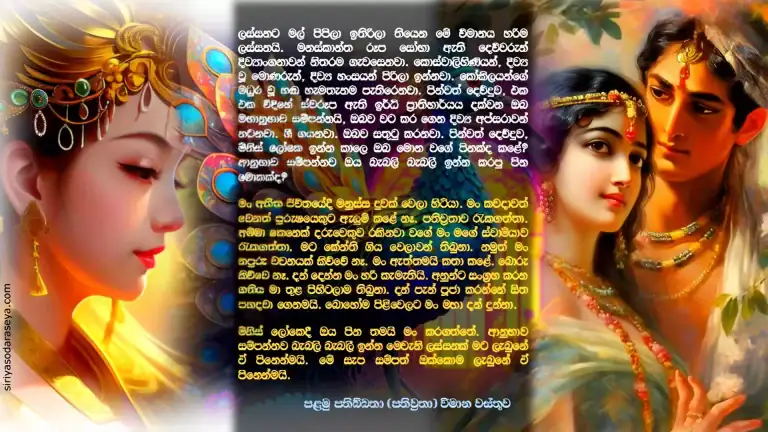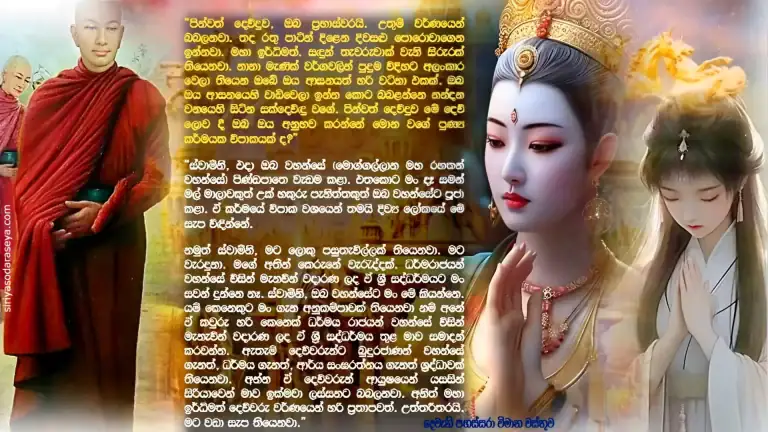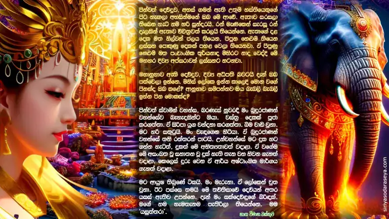 “පින්වතුනී, නුඹලා මේ කුමක්ද කරන්නෙ? හැමෝම එකතුවෙලා ජයටම සරසන්නෙ? රජතුමාවත් මේ මාවතෙන් වඩිනවද? නැත්නම් මගුල් තුලාවක්වත්ද?”