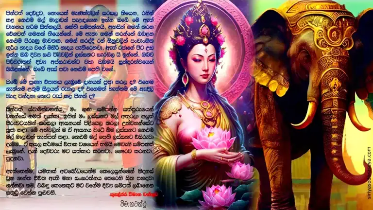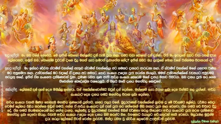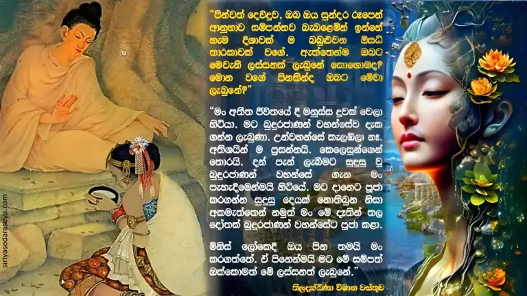 ස්වාමීනී, වෙනත් ජාතියක දී ශ්රමණයෙකුට වේවා, බ්රාහ්මණයෙකුට වේවා ආහාර පාන වස්ත්ර පාවහන් මල් සුවඳ විලවුන් සයනාසන ආවාස පහන් ආදිය දුන්නී වෙමි. ස්වාමීනී, ඒ මම් මේ ආත්මයෙහිදී ආඪ්ය වූ ත්, මහා ධන ඇත්තී වූ ත්, මහා භෝග ඇත්තී වෙමි.