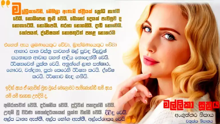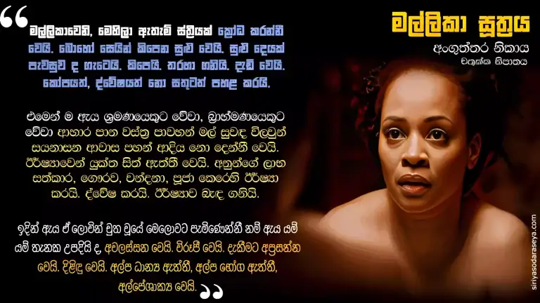 “මල්ලිකාවෙනි, මෙහිලා ඇතැම් ස්ත්රියක් ක්රෝධ ඇත්තී වෙයි. බොහෝ සෙයින් කිපෙන සුළු වෙයි. සුළු දෙයක් පැවසුව ද ගැටෙයි. කිපෙයි. තරහා ගනියි. දැඩිවෙයි. කෝපය ත්, ද්වේෂයත් නොසතුට ත් පහළ කරයි. එමෙන් ම ඇය ශ්රමණයෙකුට වේවා, බ්රාහ්මණයෙකුට වේවා ආහාර පාන වස්ත්ර පාවහන් මල් සුවඳ විලවුන් සයනාසන ආවාස පහන් ආදිය නොදෙන්නී වෙයි. ඊර්ෂ්යාවෙන් යුක්ත සිත් ඇත්තී වෙයි. අනුන්ගේ ලාභ සත්කාර, ගෞරව, වන්දන, පූජා කෙරෙහි ඊර්ෂ්යා කරයි. ද්වේෂ කරයි. ඊර්ෂ්යාව බැඳ ගනියි. ඉදින් ඇය ඒ ලොවින් චුත වූයේ මෙලොවට පැමිණෙන්නී නම් ඇය යම් යම් තැනක උපදියි ද, අවලක්ෂණ වෙයි. විරූපී වෙයි. දැකීමට අප්රසන්න වෙයි. දිළිඳු වෙයි. අල්ප ධාන්ය ඇත්තී, අල්ප භෝග ඇත්තී, අල්පේශාක්ය වෙයි.