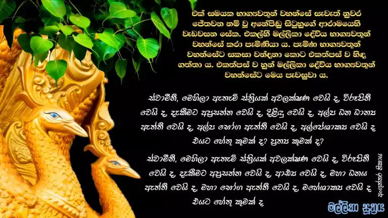 මල්ලිකාවෙනි, යම් හෙයකින් ඇතැම් ස්ත්රියක් අභිරූපවත් වෙයි ද, දර්ශනීය වෙයි ද, දුටුවන් පහදන්නී වෙයි ද, උතුම් වූ වර්ණ සෞන්දර්යයෙන් යුක්ත වන්නී වෙයි ද, ආඪ්ය වෙයි ද, මහා ධනය ඇත්තී වෙයි ද, මහා භෝග ඇත්තී වෙයි ද, මහේශාක්ය වෙයි ද එයට හේතුව මෙය යි. ප්රත්ය මෙය යි”