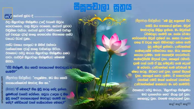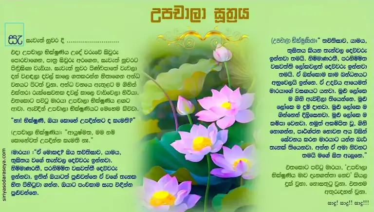 “යසෝදරාවනි, තොපට සිහි කළ හැකි ද, එදා නිග්රෝධ අසපුවෙහි දී අපගේ මුනිරාජණන් වදාළ අමා ගීය. හා! කොතරම් අගේ ද? දිවියේ සැඟැවී ගිය අරුත්. මෙතරම් ම විසිතුරු ද! මා දෙසවනේ නම් තවමත් රැවුදේ”
