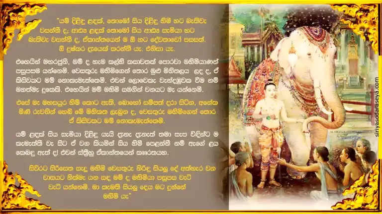 නමුත් සිහිකරව මපුත, එදා ජාලිය කන්හජිනා දන්දෙද්දී මද්දී වූ නුඹ එය ඉවසා සිටියා නොවේද? නුඹ කුසින් වැදූ දරුවන් දන්දෙද්දී උන්ගේ දෑත් බැඳී වර පට පමණක් මේ සිනේරු පර්වත රාජයාට වඩා වැඩි නොවේද? ඒ කිසිකලකත් නුඹ දොම්නස් නොවුනු වග බුදු මුවින්ම වදාලා නුඹට අමතකද?