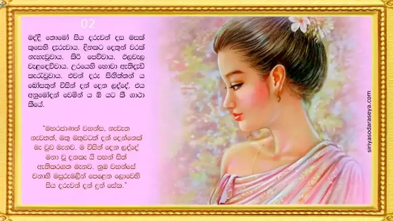 “එහෙත් දියණිය, ස්ත්රියක වූ පමණෙකින් සියල්ල වැළැලී ගිය සැටි. නිදහස් සුවය නොලද හැකි මේ ස්ත්රිත්වය කුමට ද? එදා මා ඒ භික්ෂුණී භාවය ඉල්ලා කොතෙක් ආයාචනා කළා ද? ඒ භාග්යවතුන් වහන්සේ කුමක් හෙයින් නොදෙන සේක් ද?”