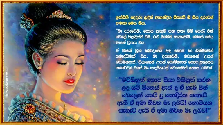 එවදන් ඇසීමෙන් ශාක්ය ලලනාවෝ නව ජීවිතයක් ලැබූ කලෙක පරිද්දෙන් ඔද වැඩුණු සිත් ඇති වූහ. හිරු රැස් වැදී පිපී ගිය පියුම් සේ ප්රමුදිතව සතුටින් ඉපිලී ගියහ. එවිට ම යසෝදරාව නැගී සිටියා ය. මෘදු සිහින් හඬින් ඇමතුවා ය.