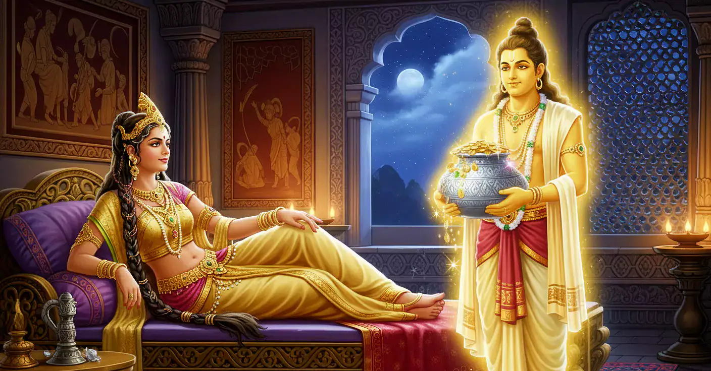 At that time, people lived ten thousand years. One night, the palace doors were closed, and the princess sat alone on the terrace of her seven-storey mansion, meditating on her virtue. Then Sakka appeared, carrying a golden dish of coins. Standing to one side, he spoke to her: