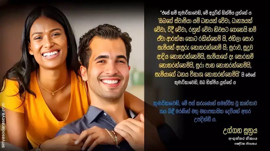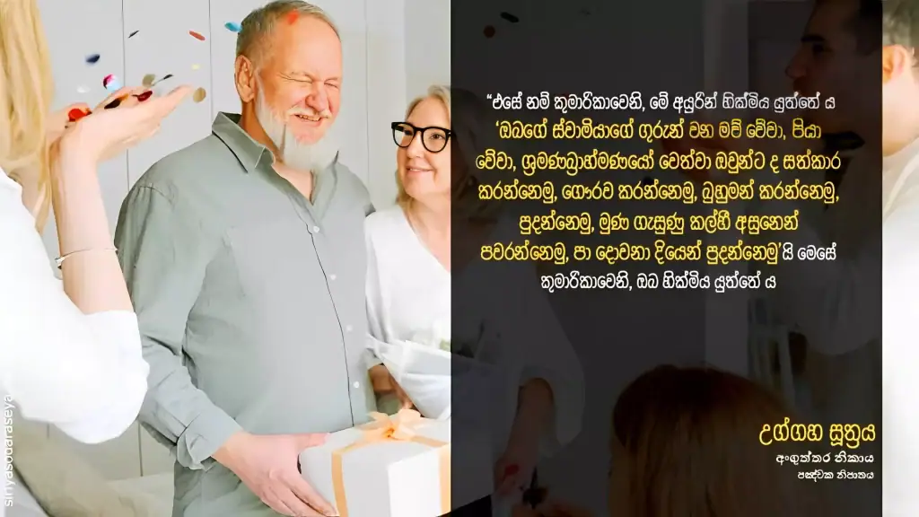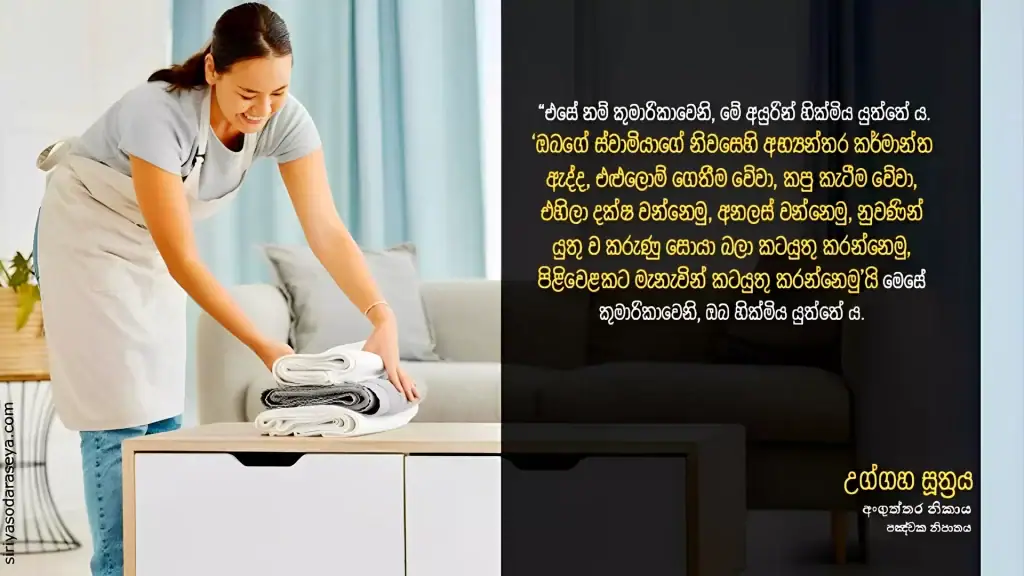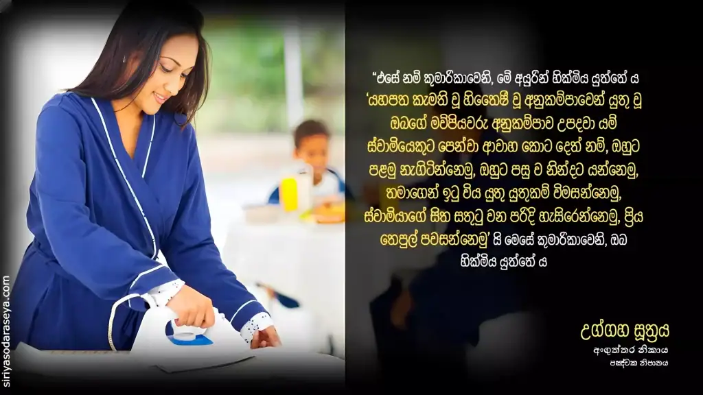 “එසේ නම් කුමාරිකාවෙනි, මේ අයුරින් හික්මිය යුත්තීහු ය. ‘යහපත කැමති වූ හිතෛෂී වූ අනුකම්පාවෙන් යුතු වූ ඔබගේ මව්පියවරු අනුකම්පාව උපදවා යම් ස්වාමියෙකුට පෙන්වා ආවාහ කොට දෙත් නම්, ඔහුට පළමු නැගිටින්නෙමු, ඔහුට පසු ව නින්දට යන්නෙමු, තමාගෙන් ඉටු විය යුතු යුතුකම් විමසන්නෙමු, ස්වාමියාගේ සිත සතුටු වන පරිදි හැසිරෙන්නෙමු, ප්රිය තෙපුල් පවසන්නෙමු’ යි මෙසේ කුමාරිකාවෙනි, ඔබ හික්මිය යුත්තීහු ය.