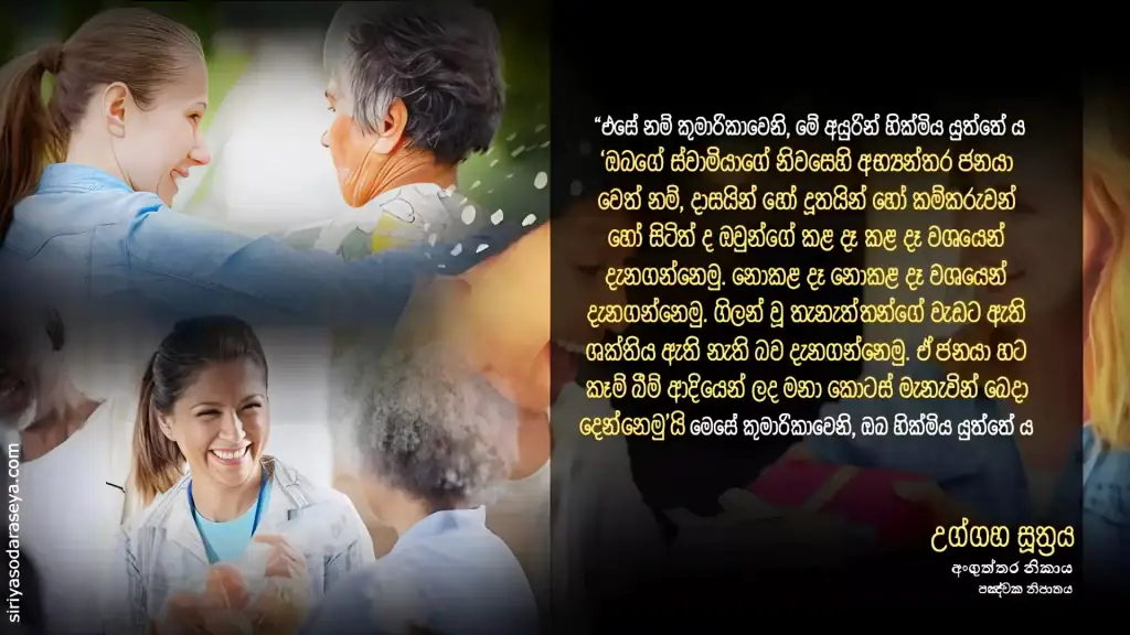 එසේ වී නම් කුමාරිකාවෙනි, මේ අයුරින් හික්මිය යුත්තීහු ය. ‘ඔබගේ ස්වාමියාගේ නිවසෙහි අභ්යන්තර ජනයා වෙත් නම්, දාසයින් හෝ දූතයින් හෝ කම්කරුවන් හෝ සිටිත් ද ඔවුන්ගේ කළ දෑ කළ දෑ වශයෙන් දැනගන්නෙමු. නොකළ දෑ නොකළ දෑ වශයෙන් දැනගන්නෙමු. ගිලන් වූ තැනැත්තන්ගේ වැඩට ඇති ශක්තිය ඇති නැති බව දැනගන්නෙමු. ඒ ජනයා හට කෑම් බීම් ආදියෙන් ලද මනා කොටස් මැනැවින් බෙදා දෙන්නෙමු’ යි මෙසේ කුමාරිකාවෙනි, ඔබ හික්මිය යුත්තීහු ය.