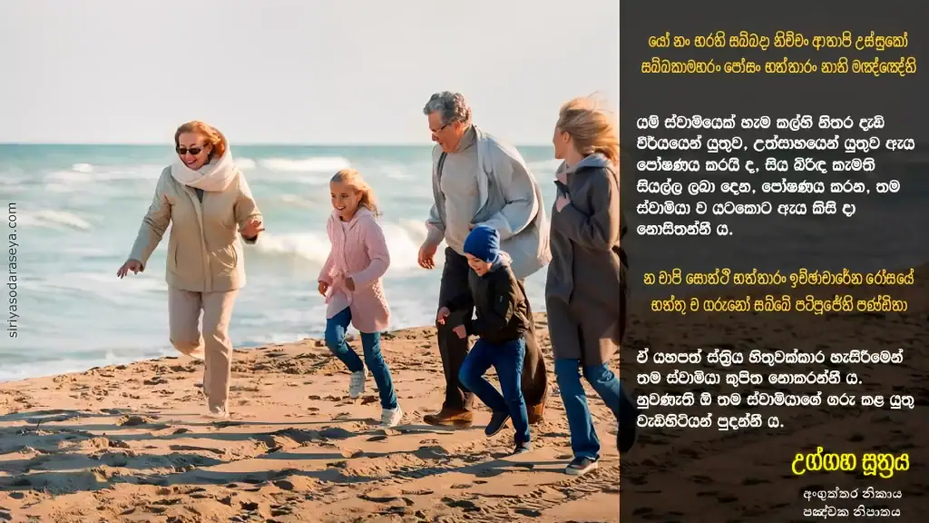 යම් ස්වාමියෙක් හැම කල්හි නිතර දැඩි වීර්යයෙන් යුතුව, උත්සාහයෙන් යුතුව ඇය පෝෂණය කරයි ද, සිය බිරිඳ කැමති සියල්ල ලබා දෙන, පෝෂණය කරන, තම ස්වාමියා ව යටකොට ඇය කිසිදා නොසිතන්නී ය.