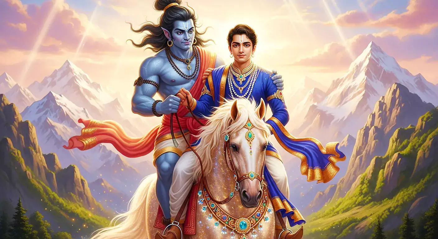 “Punnaka, having mounted his horse, a charger fit for bearing the gods, himself richly adorned and with his beard and hair trimmed, went through the sky.